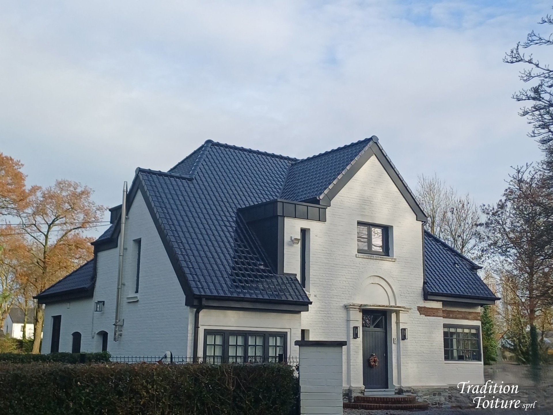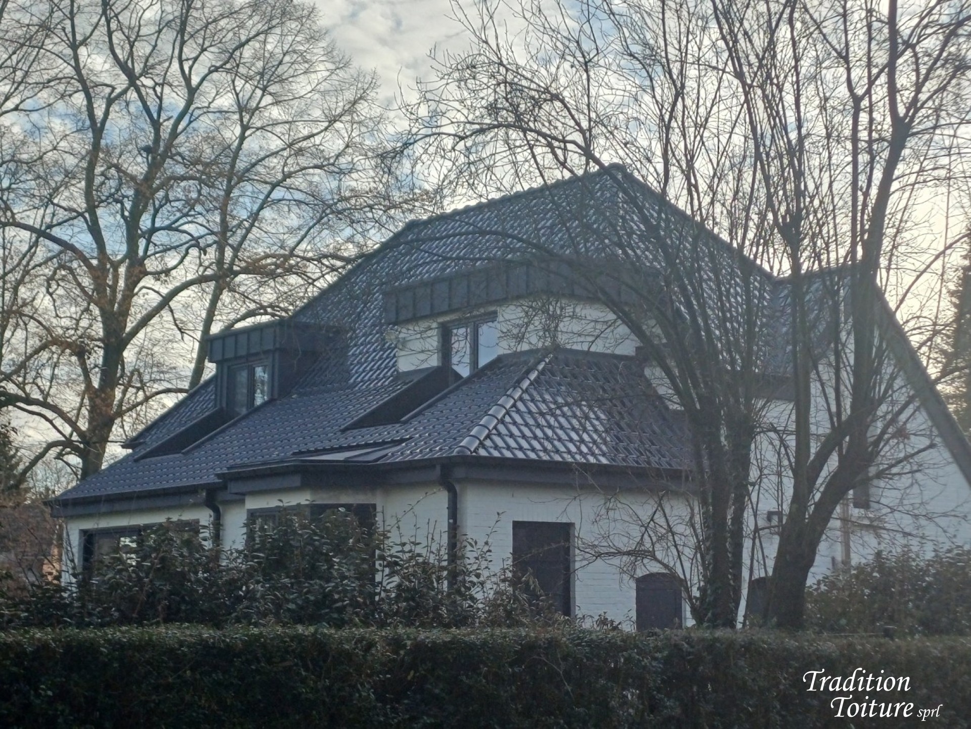 Renouvellement de la couverture en tuiles POTTELBERG 44 NOIR EMAILLE 738, de la zinguerie en zinc ATZ, l' isolation en panneaux sarking, plate-forme en EPDM ainsi que le bardage des joues de lucarnes en Alu Noir.